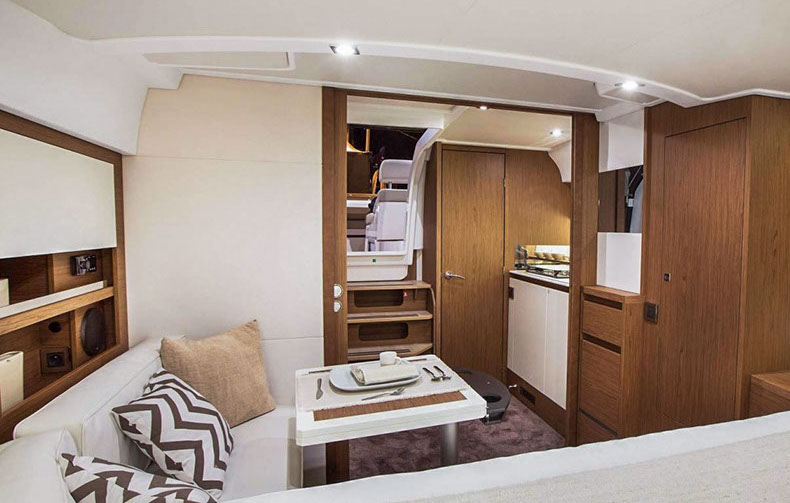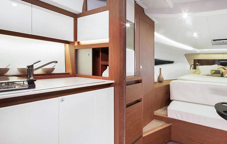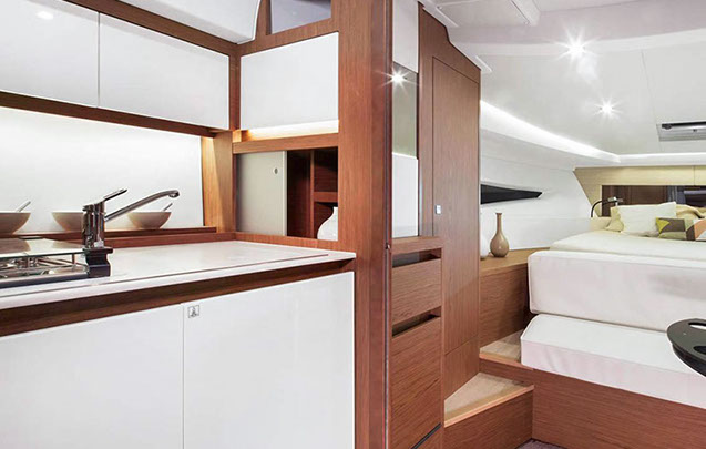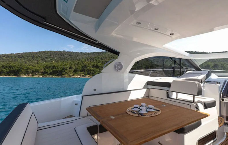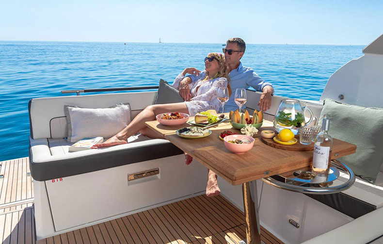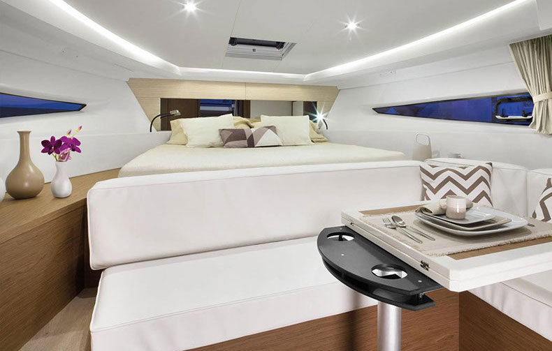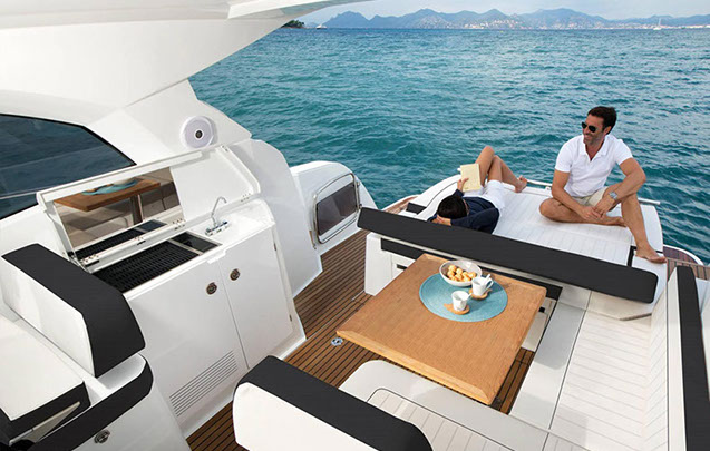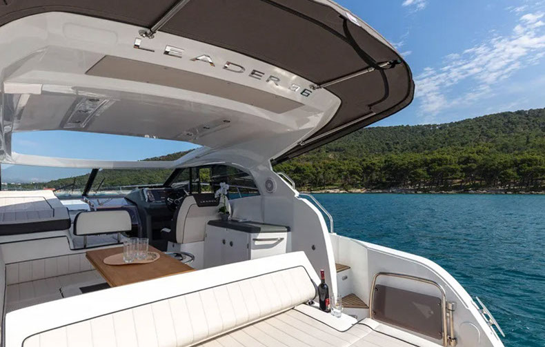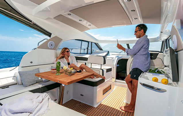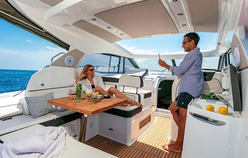 À bord du Leader 36, tout semble facile : large plateforme de bain, espaces modulables, belle cuisine extérieure équipée, circulation de plain-pied, sonorisation, toit ouvrant électrique….